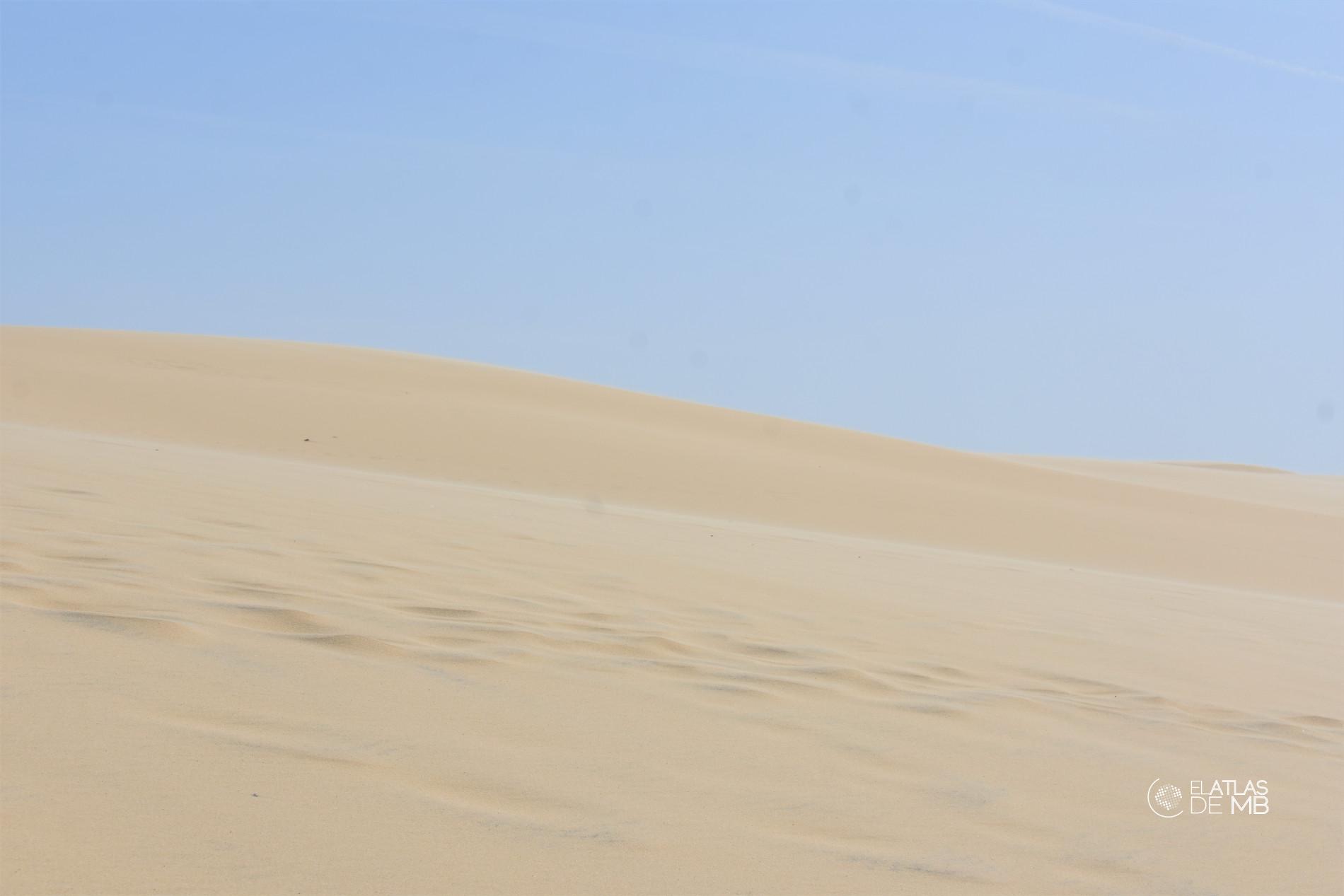 Su cresta llega a más de 100 metros de altura, siendo la más alta de Europa, y realmente cuesta subirla y cansa bastante. Verás que casi todo el mundo sigue unos surcos, y pareciera que uno va a través del desierto. Cuando se llega arriba se tienen unas vistas alucinantes de toda la duna, que casi se pierde en el horizonte y me pareció una maravilla. También hacia el mar, con pequeñas islas formadas por bancos de arena, en un mar poco profundo. Es que era sublime.