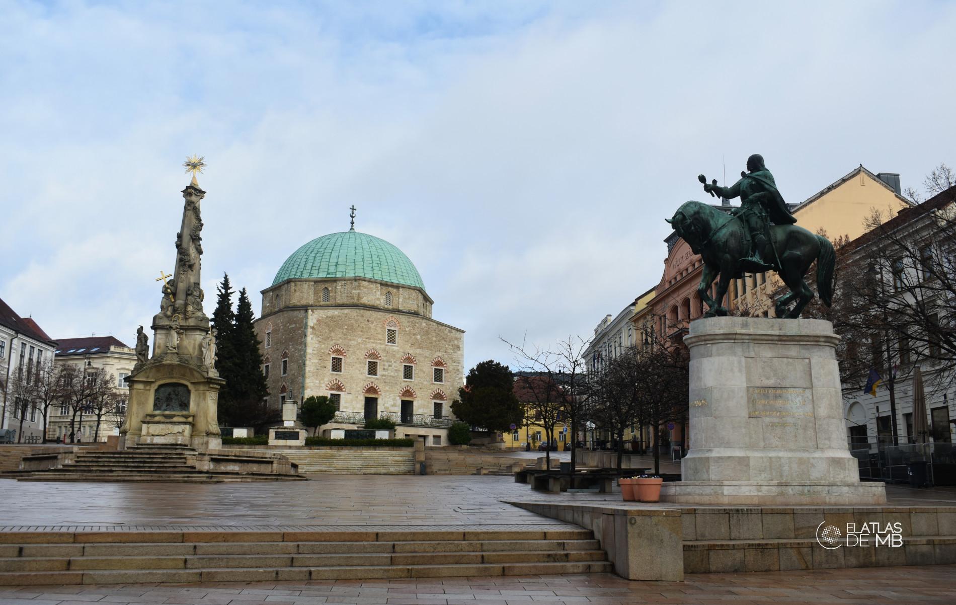 Y ya llegamos al centro neurálgico de Pécs, la plaza Szechenyi (como no podía ser de otra manera). Una plaza preciosa, jalonada de edificios tan bonitos como el Ayuntamiento o el Gobierno regional de Baranya, con tejas que simulan los motivos de porcelana de Zsolnay. Este fue el lugar donde se ponía el mercado de la ciudad, y ahora está presidida por la estatua ecuestre de János Hunyadi, gobernante y comandante húngaro que hizo frente a los otomanos en el siglo XV. En el centro está la columna de la Trinidad, que como en todas partes de Centroeuropa, conmemoran la supervivencia ante las plagas. También verás el termómetro, barómetro e higrómetro de Pécs, de 1908, me pareció bonito.