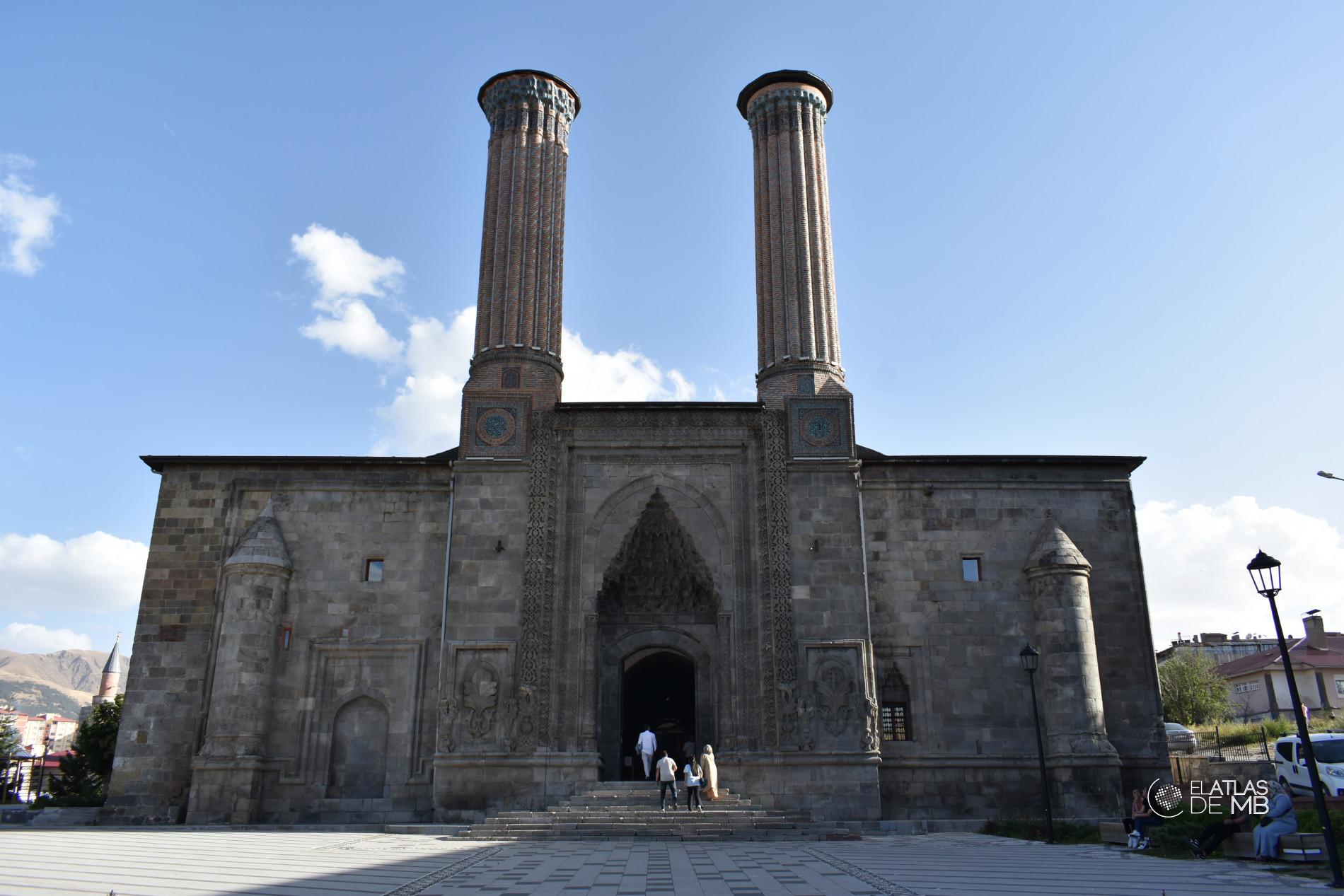 Y frente a todo ello se alza la postal más típica de Erzurum: la madrasa de los minaretes gemelos. Completada en 1265, data del periodo final selyúcida. Es un referente en la arquitectura que ha inspirado otras madrasas y mezquitas del mundo otomano. Llama la atención su imponente fachada con sus dos minaretes, que le da su nombre, con profusa decoración en piedra y cerámica, y su patio arcado.
